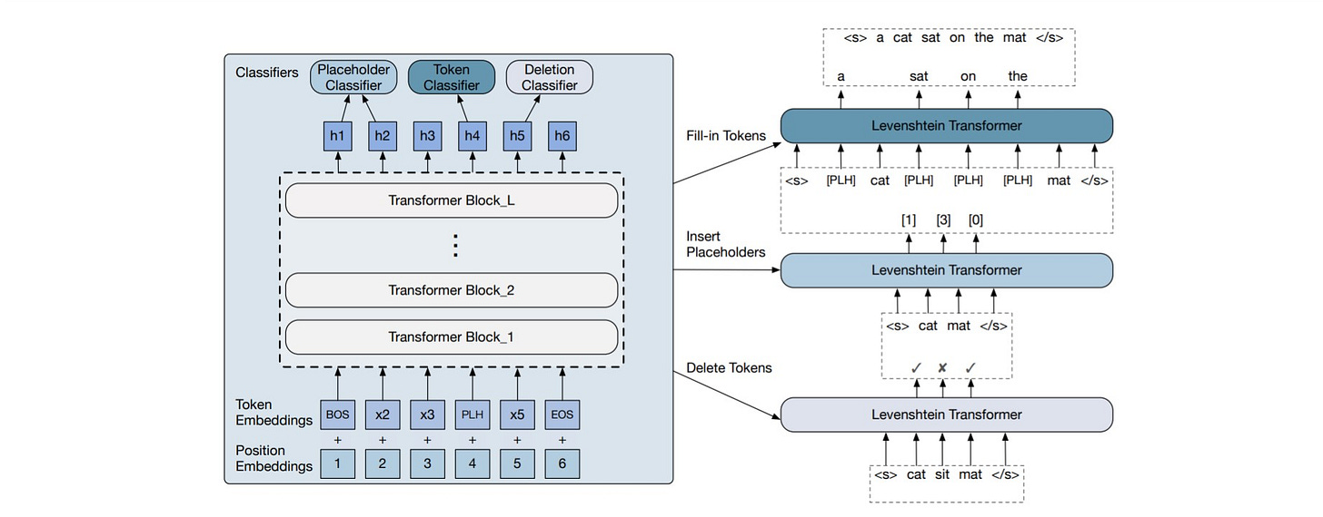 Levenshtein Transformer [3] is a partially autoregressive model that addresses the pre-existing architectures' lack of flexibility. Trained using imitation learning, it has two policies, Insertion and Deletion, executed alternately.